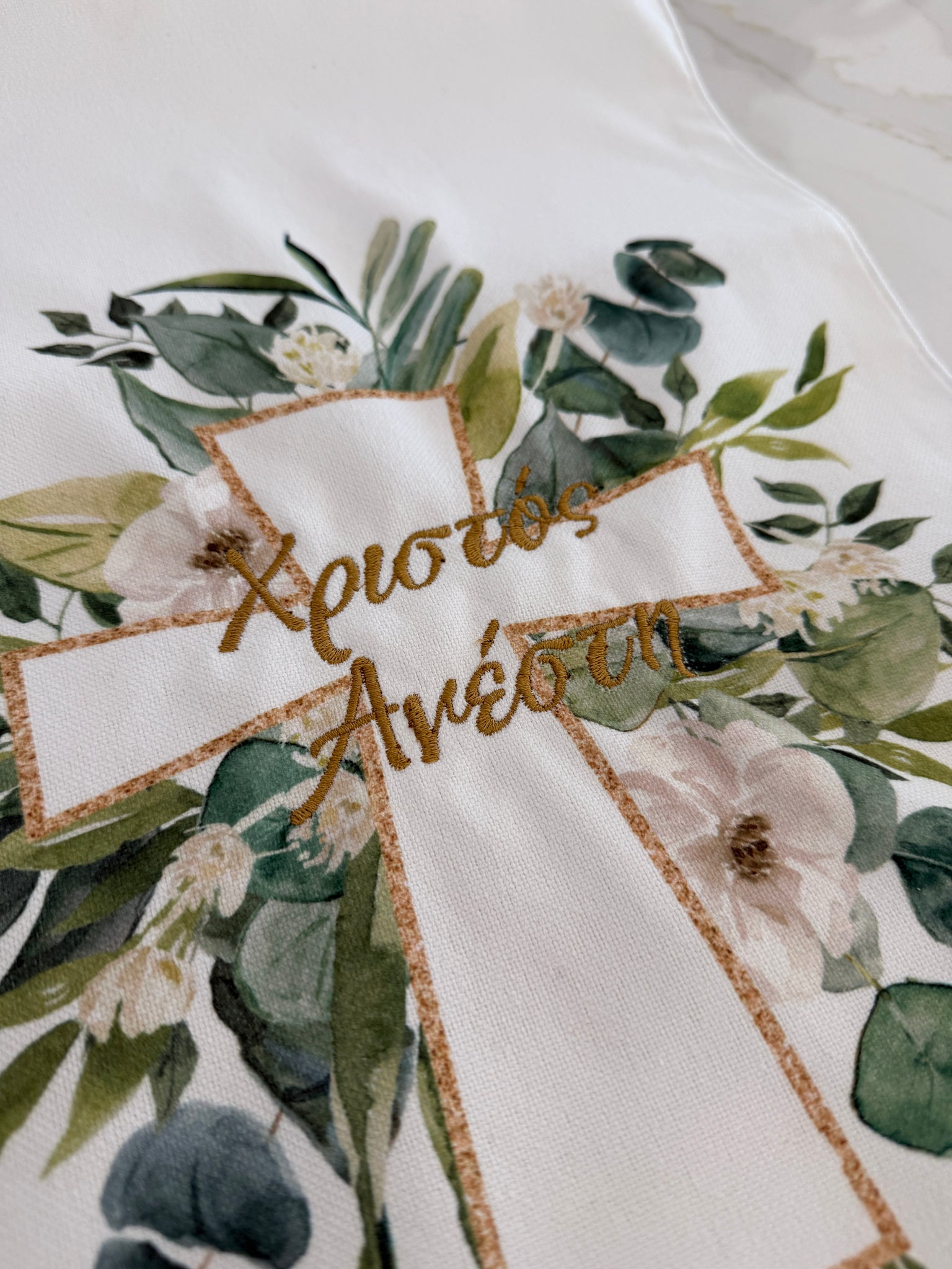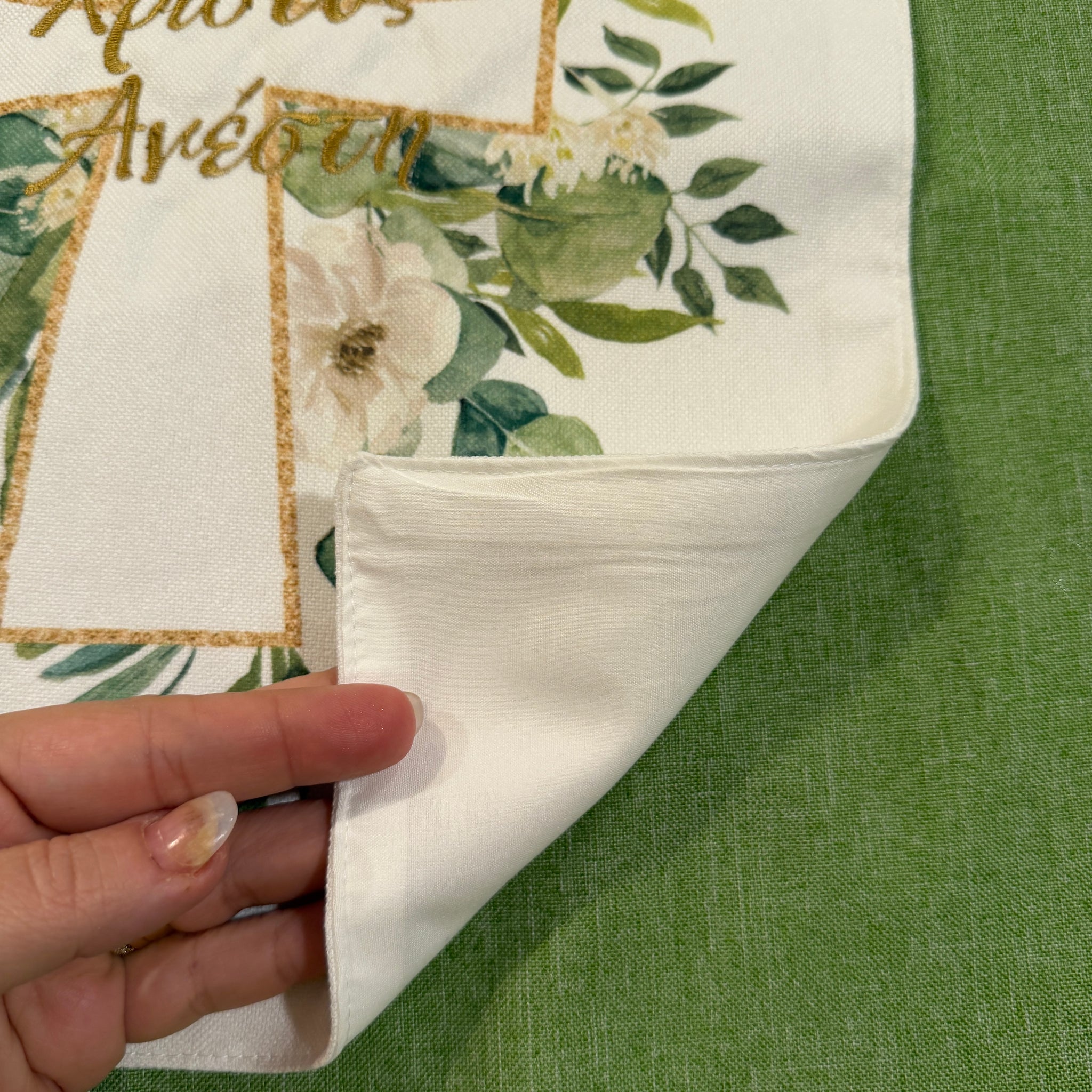 Featuring the Greek phrase “Xristos Anesti” embroidered at both ends, this piece is complemented by a printed cross and soft greenery motif for a timeless, faith-inspired look. The mirrored design on each end makes it perfect for any table setting, whether for a festive gathering or a meaningful family meal.